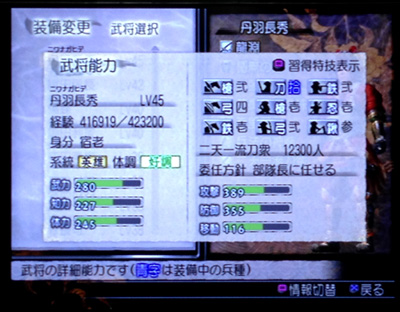 それでも1周目は武力193:知力215:体力159だったので大分強化出来たと♪それに総合的な能力では間違いなく織田軍最強です!信長の各能力を全て越えてます。このニワさんなら天下もとれる!ニワさんも実は重瞳の持ち主だったのかも?あの小さい瞳をじっくり見つめれば…実は…w全特技を身につけることもできましたし。菩提樹装備の効果ってほんと強力ですね。